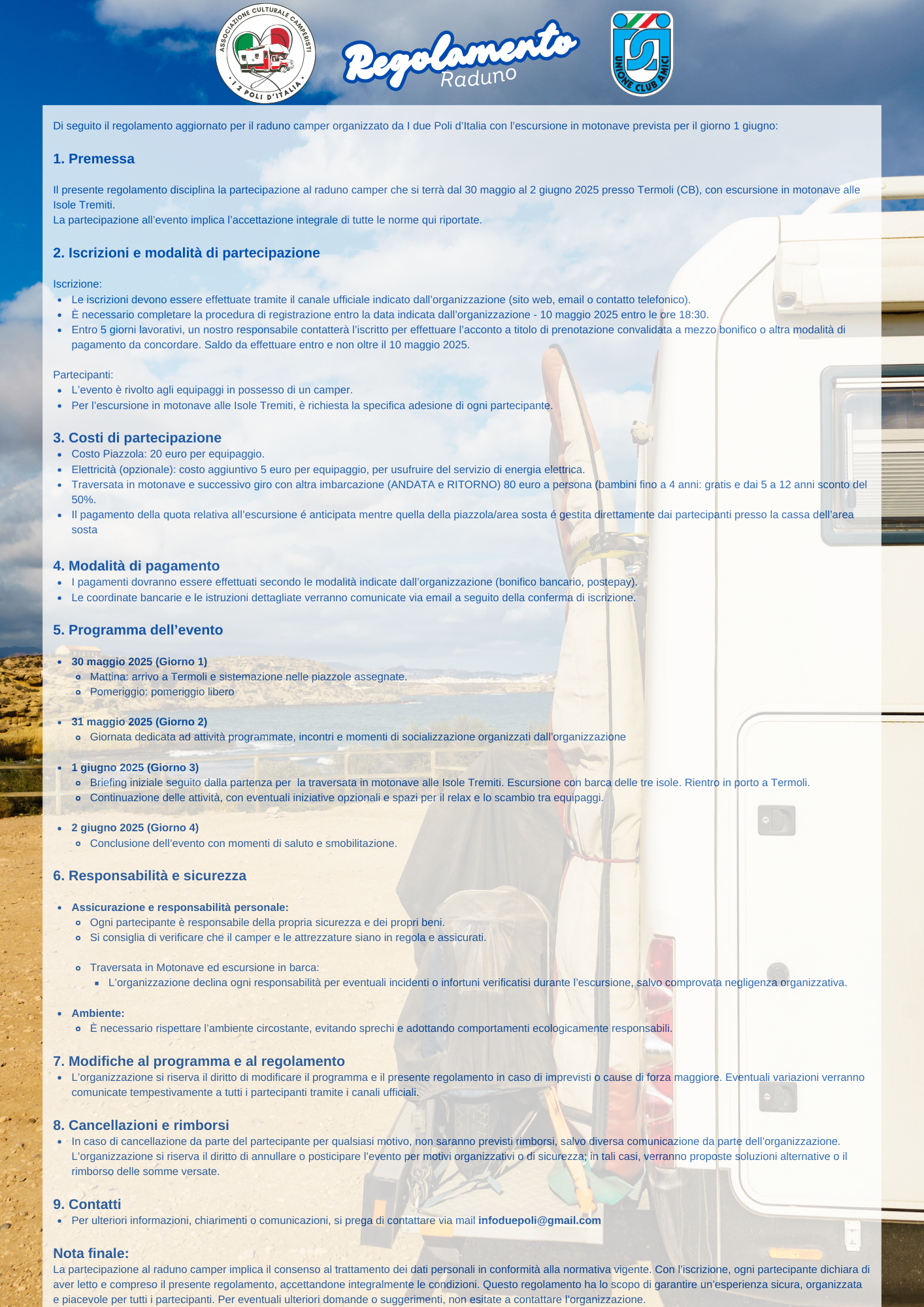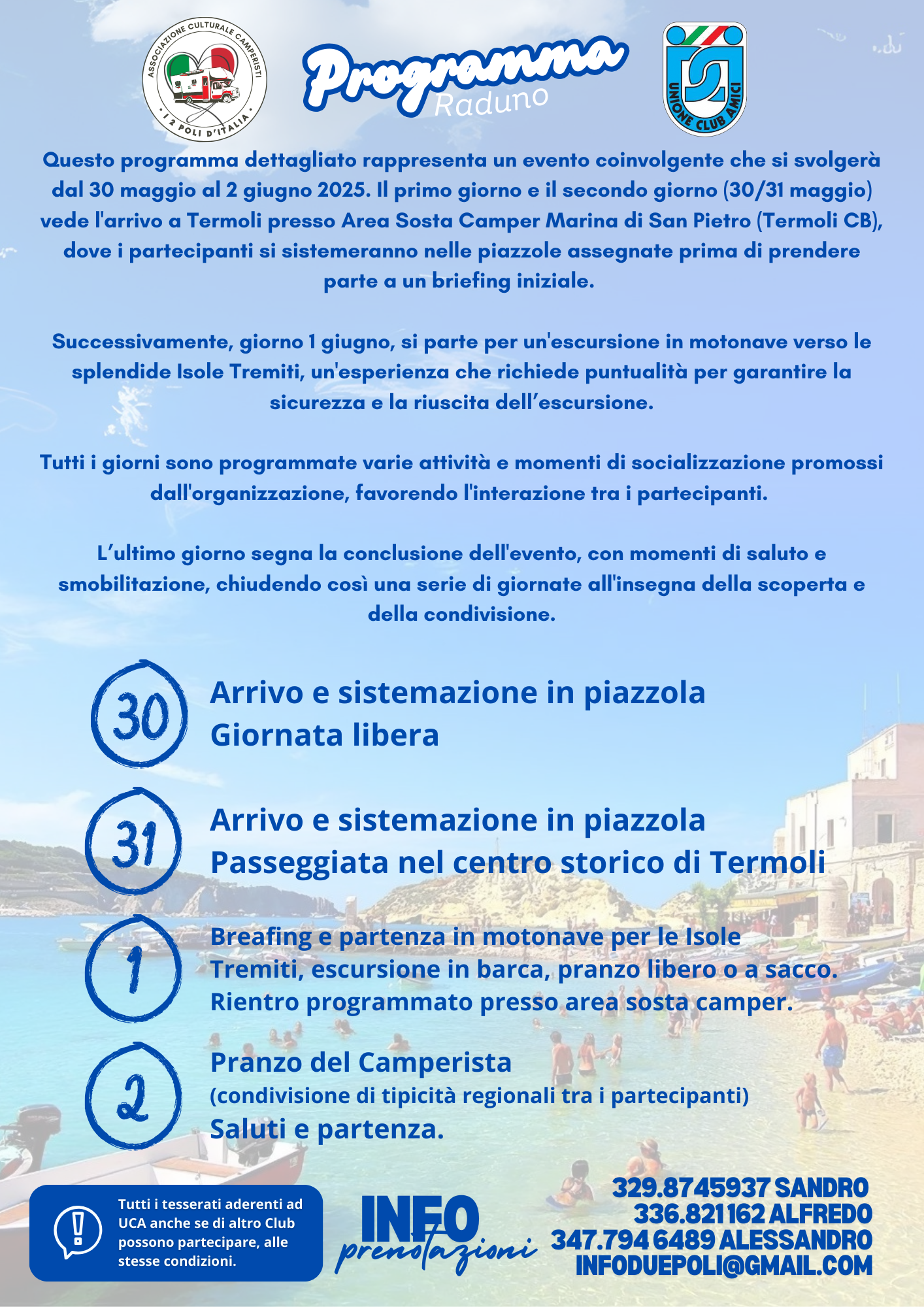 Questo programma dettagliato rappresenta un evento coinvolgente che si svolgerà dal 30 maggio al 2 giugno 2025. Il primo giorno e il secondo giorno (30/31 maggio) vede l’arrivo a Termoli presso Area Sosta Camper Marina di San Pietro (Termoli CB), dove i partecipanti si sistemeranno nelle piazzole assegnate prima di prendere parte a un briefing iniziale.