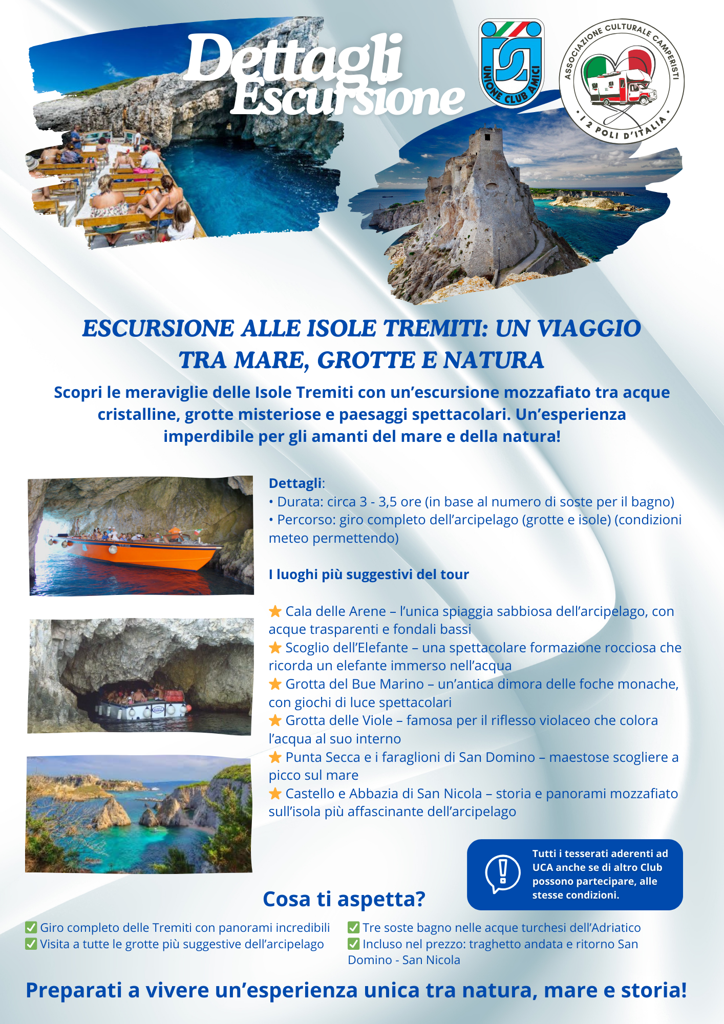 Successivamente, giorno 1 giugno, si parte per un’escursione in motonave verso le splendide Isole Tremiti, un’esperienza che richiede puntualità per garantire la sicurezza e la riuscita dell’escursione.
